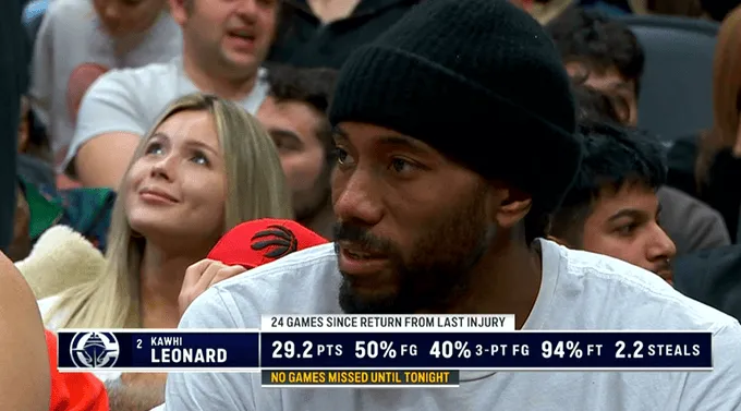 赛中,转播方给出了科怀-伦纳德自上次伤愈复出后24场比赛的数据:场均29.2分、投篮命中率50%、三分命中率40%、罚球命中率94%、场均2.2次抢断。直至今晚前保持全勤。